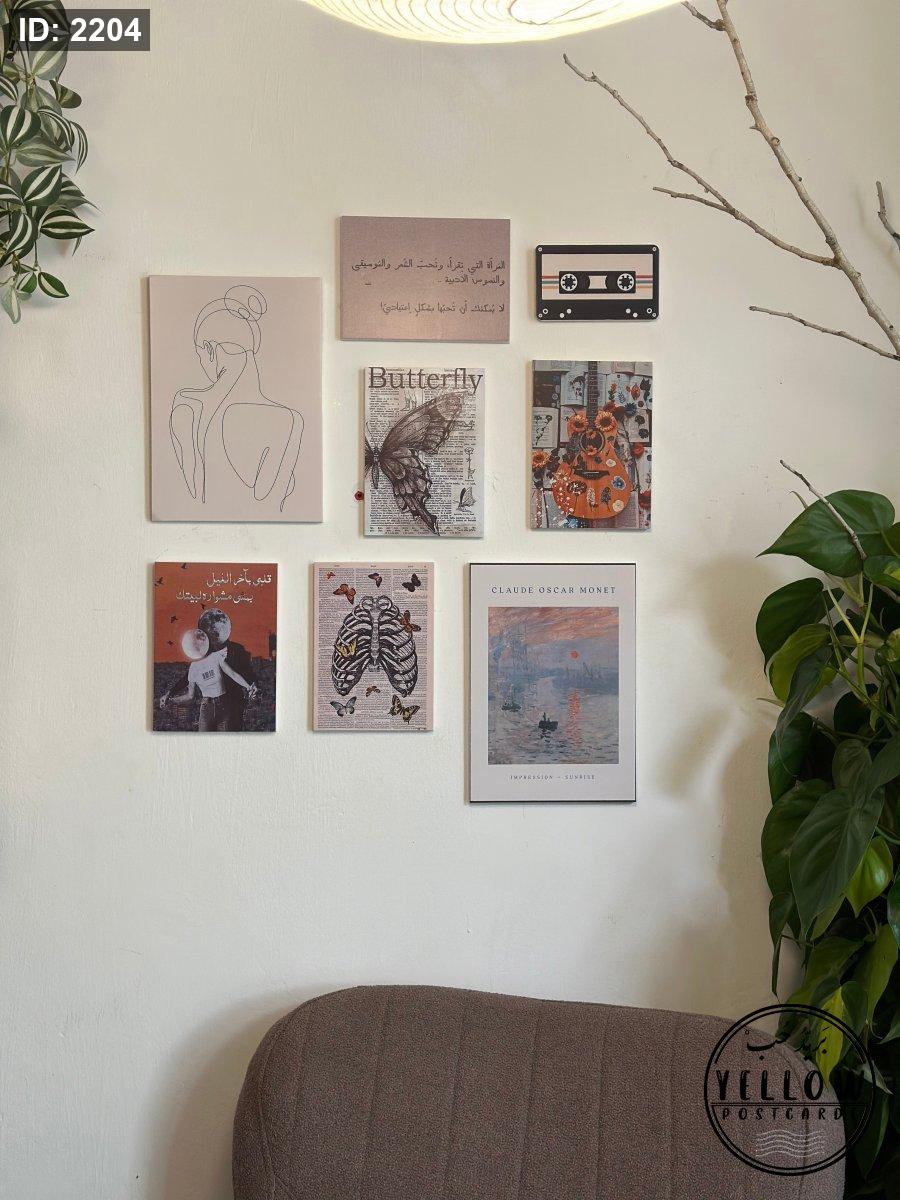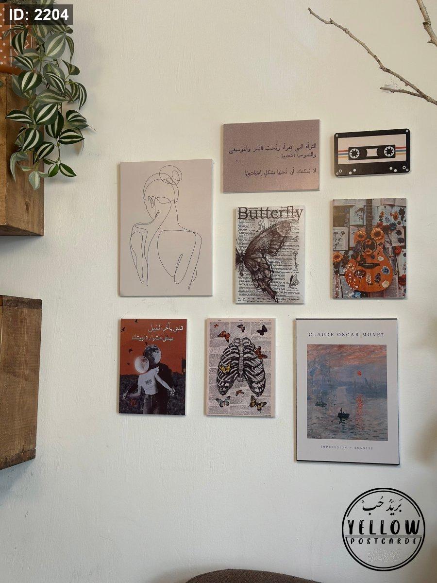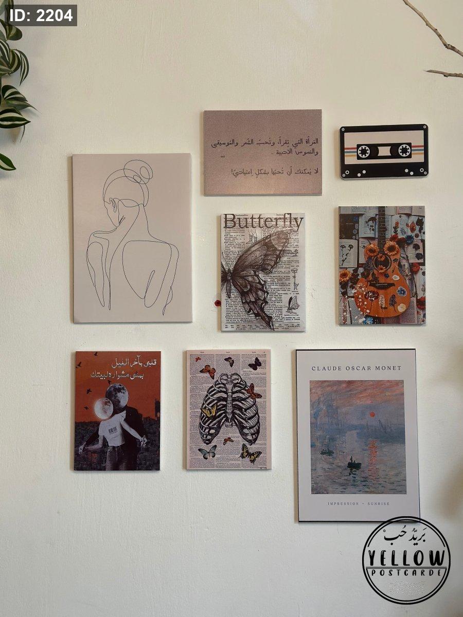 تحتوي على عناصر مثل فراشات، آلة غيتار، شريط كاسيت، ورسومات لجسد أنثوي بخطوط بسيطة، إلى جانب لوحة لعمل فني كلاسيكي للفنان Claude Monet.