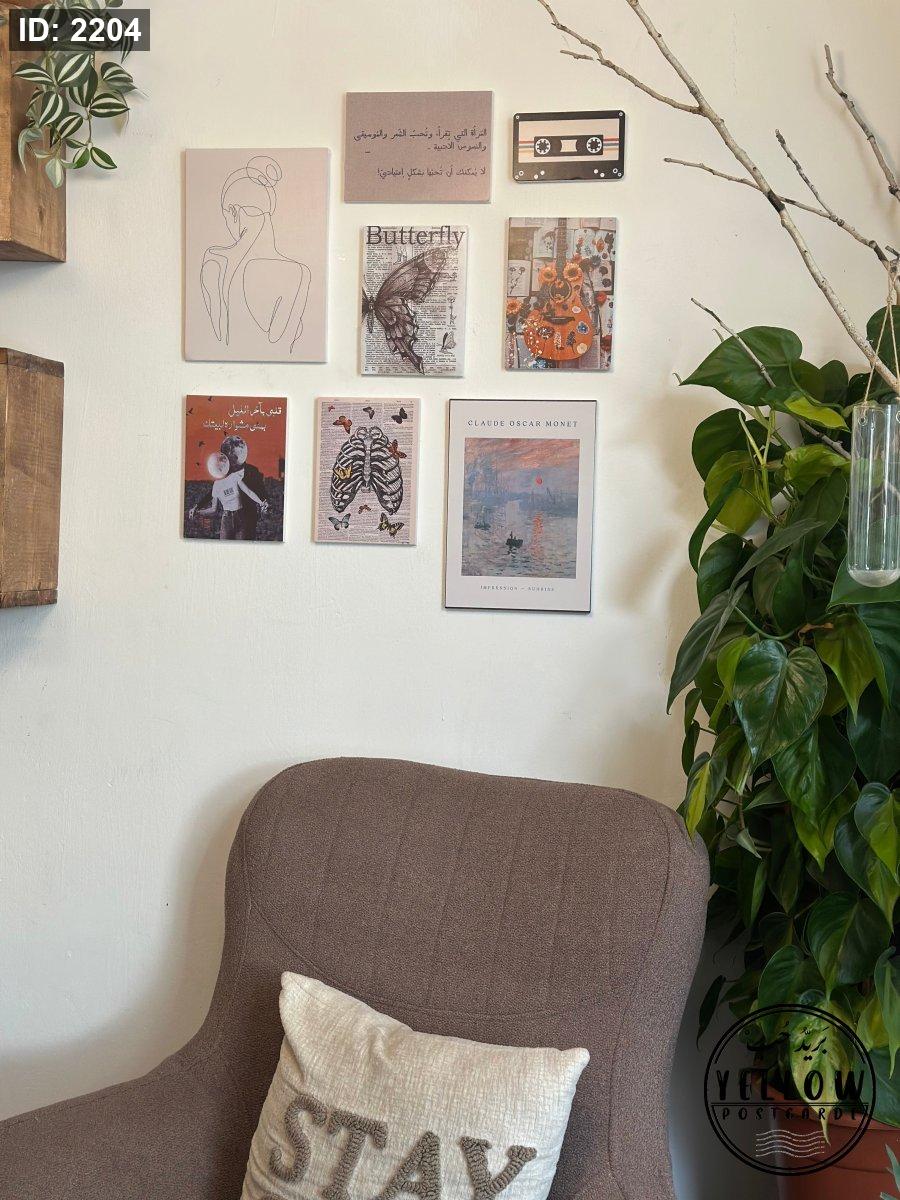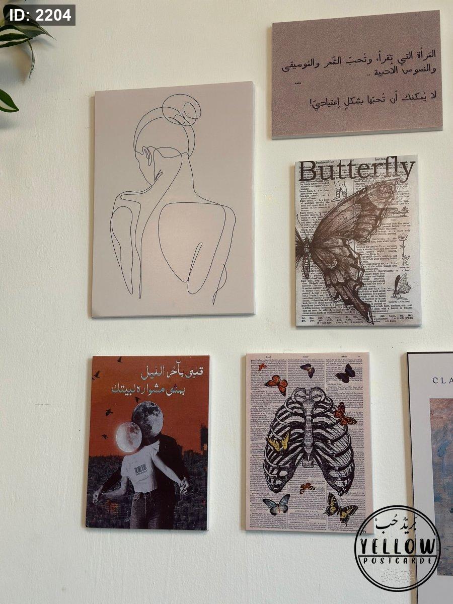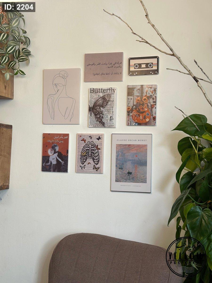 تحتوي على عناصر مثل فراشات، آلة غيتار، شريط كاسيت، ورسومات لجسد أنثوي بخطوط بسيطة، إلى جانب لوحة لعمل فني كلاسيكي للفنان Claude Monet.