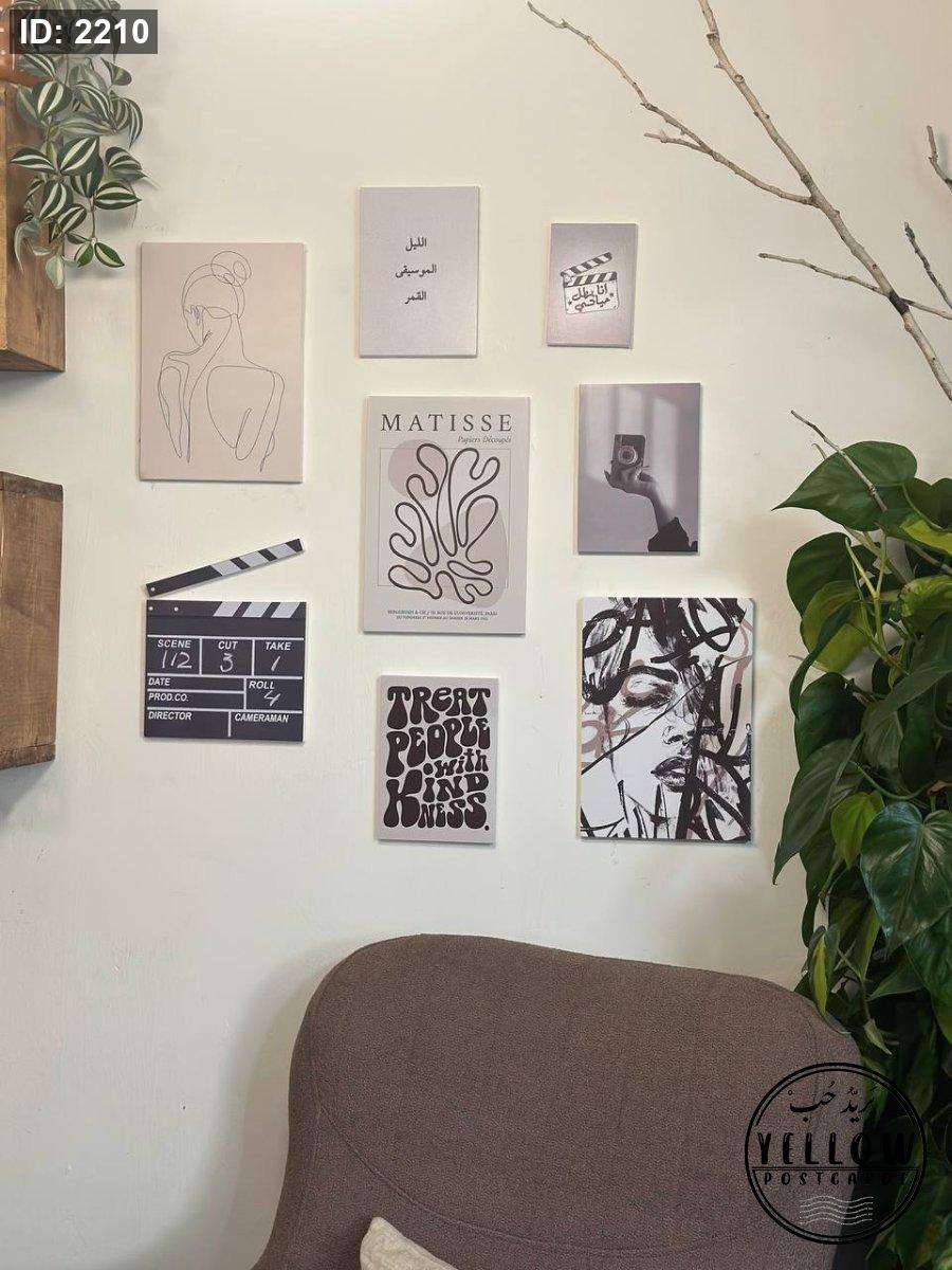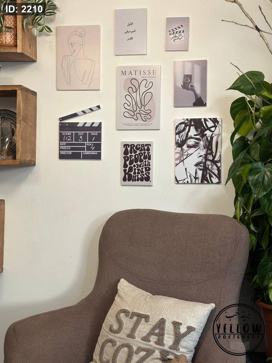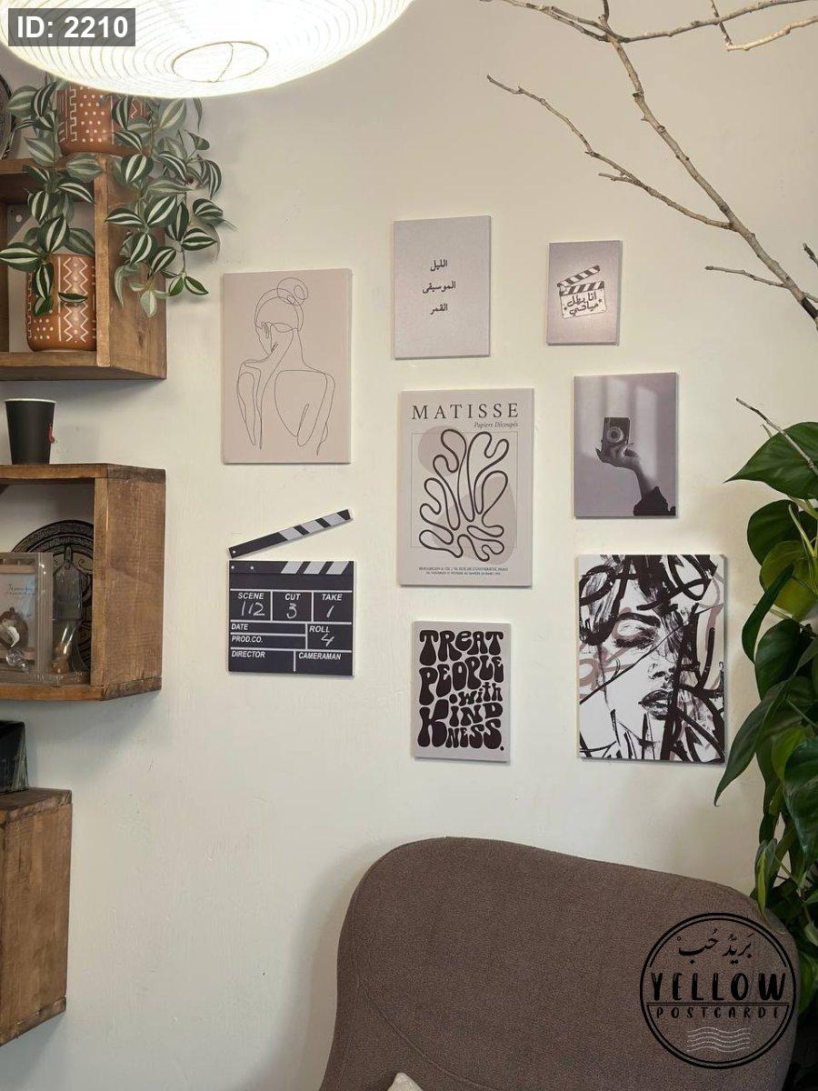 جدارية مكوّنة من مجموعة لوحات فنية بصرية ونصّية، تتميز بتصاميم ناعمة وألوان حيادية مستوحاة من الفن المعاصر.