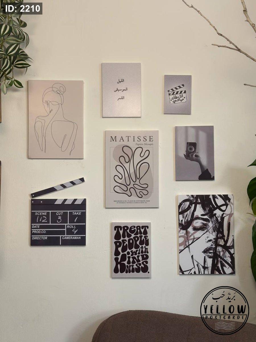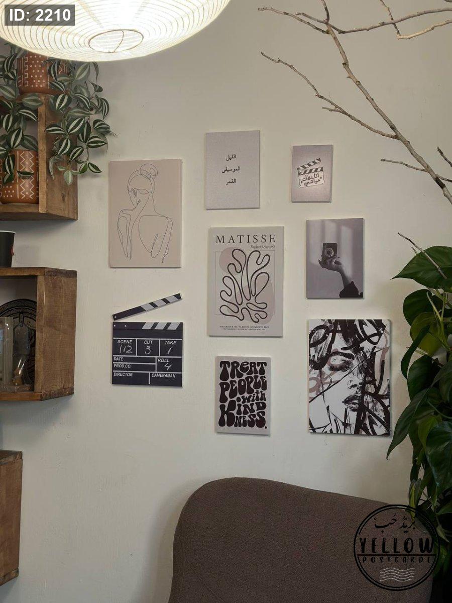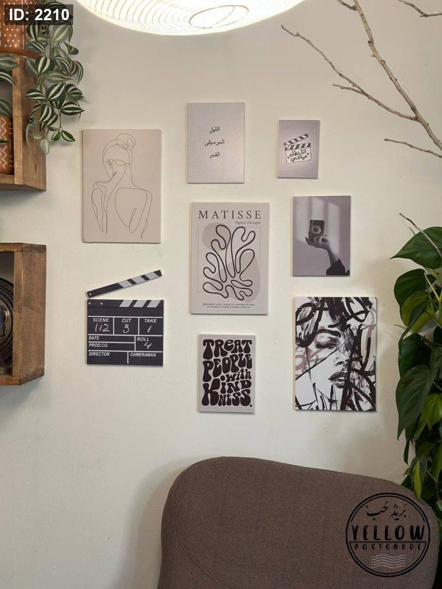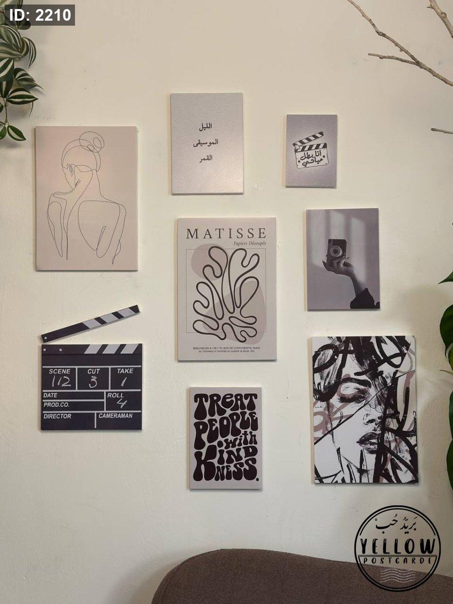 جدارية مكوّنة من مجموعة لوحات فنية بصرية ونصّية، تتميز بتصاميم ناعمة وألوان حيادية مستوحاة من الفن المعاصر.