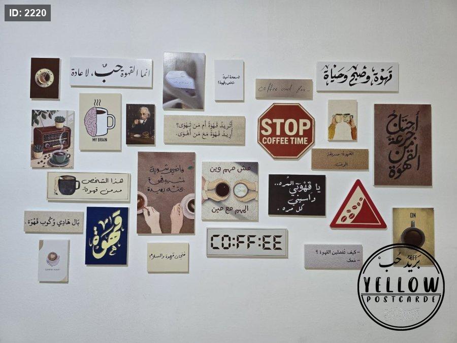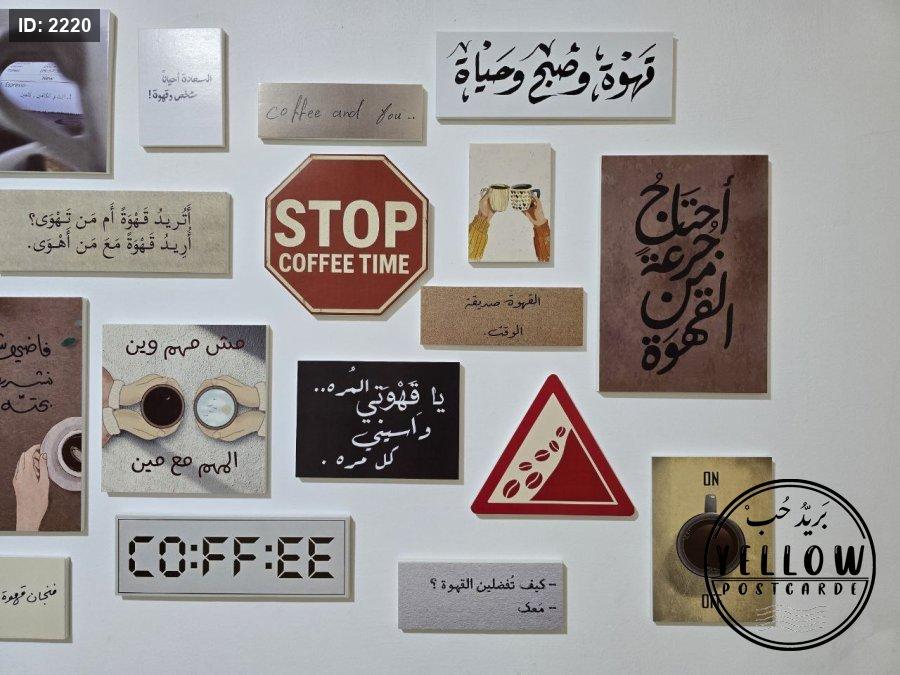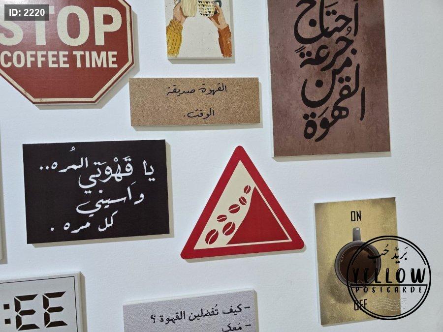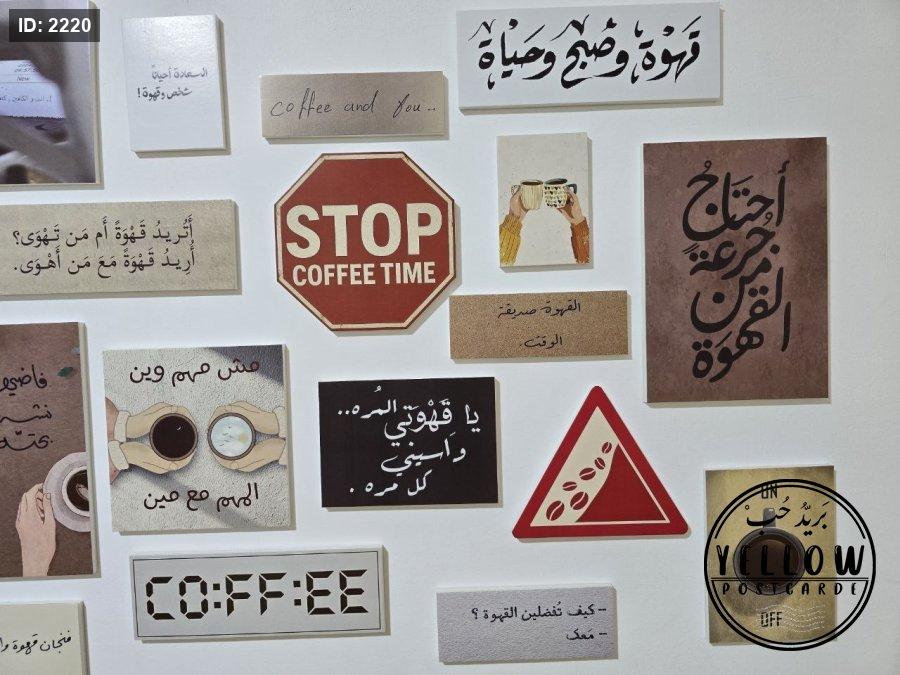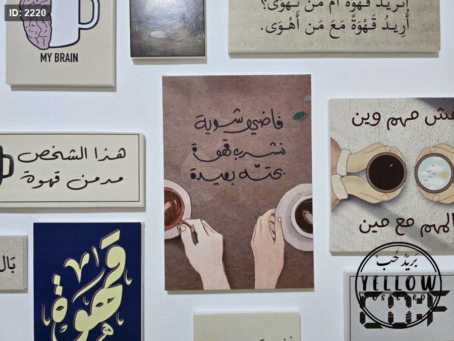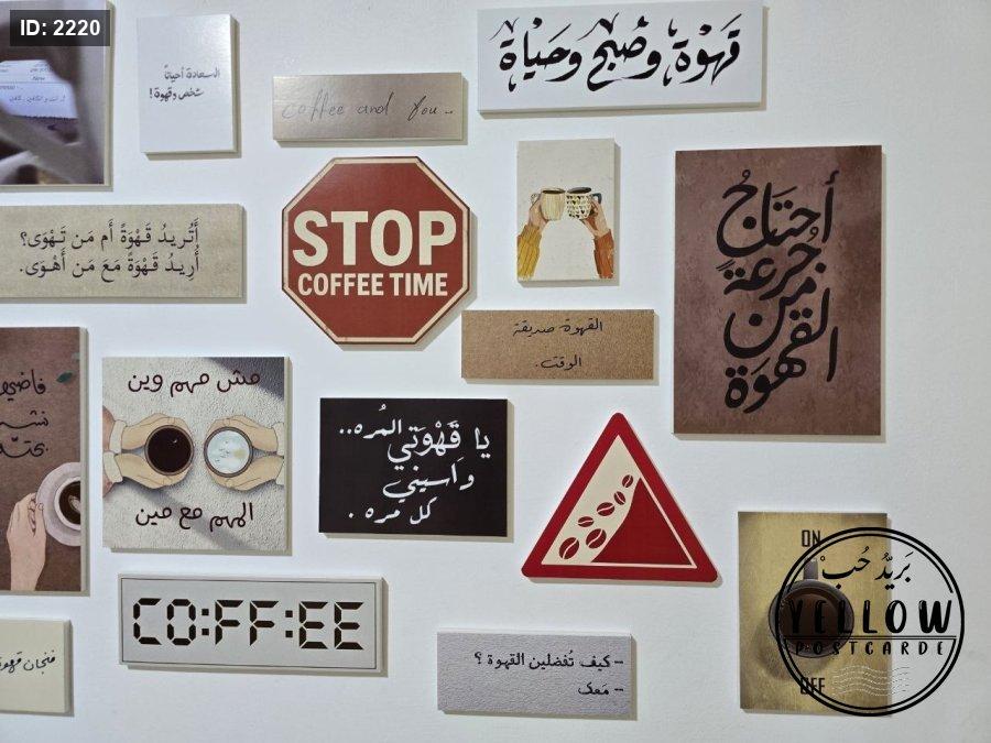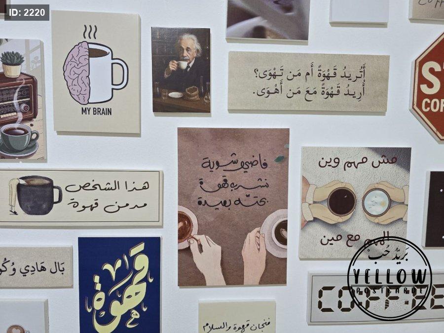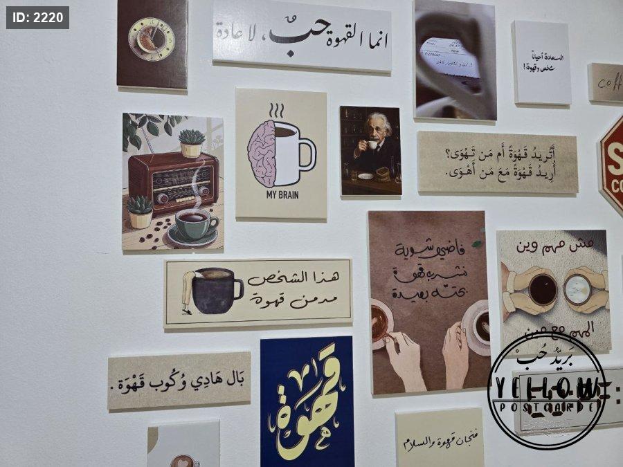 مجموعة فنية مميزة مُرتَّبة على الحائط تتكوّن من لوحات مختلفة الأحجام، كلها تدور حول ثيمة القهوة بروح دافئة ولمسات كلاسيكية. تظهر في الجدارية عبارات عربية بخط جميل، ورسومات يدوية، وصور فوتوغرافية، مما يعطي المكان طابعًا هادئًا ومليئًا بالطاقة الإبداعية.