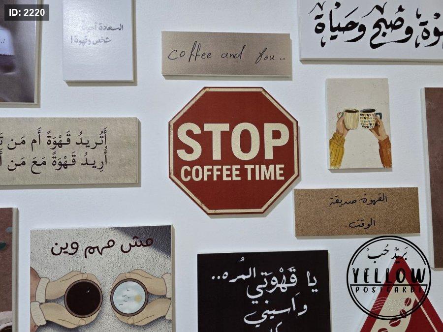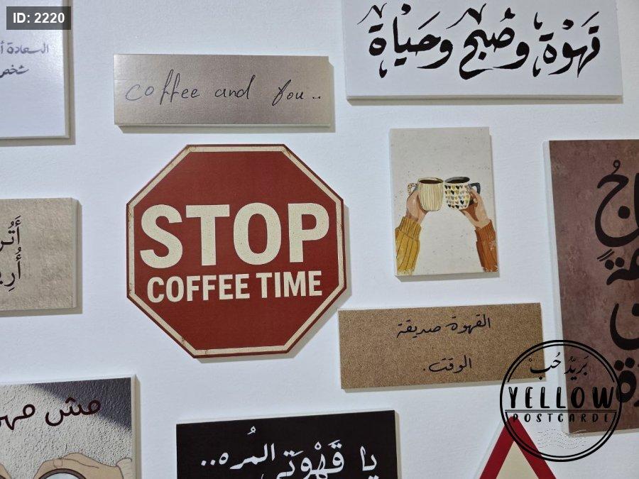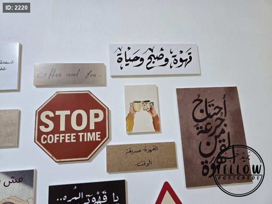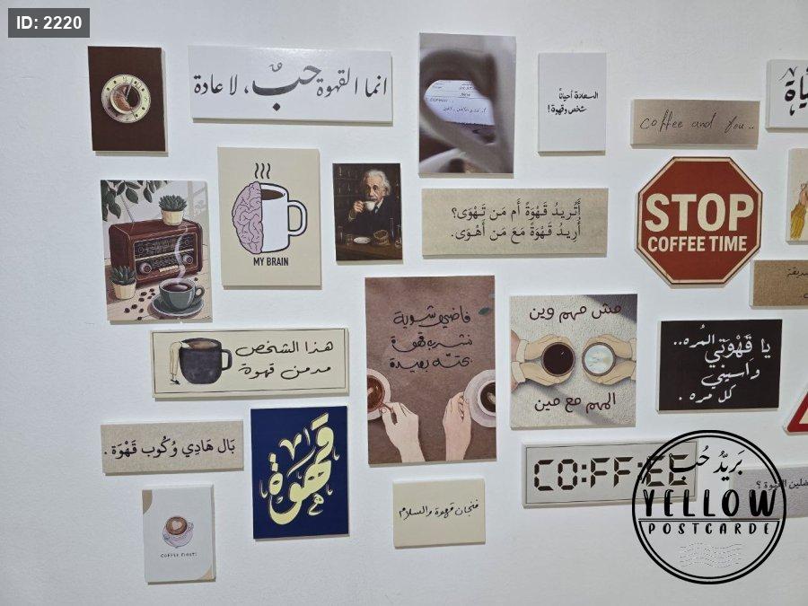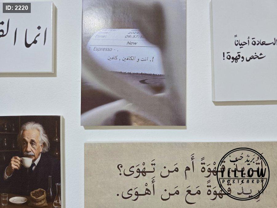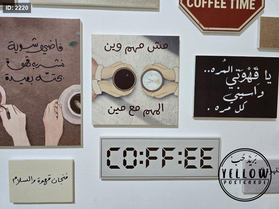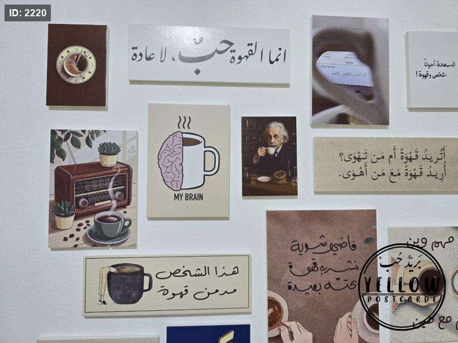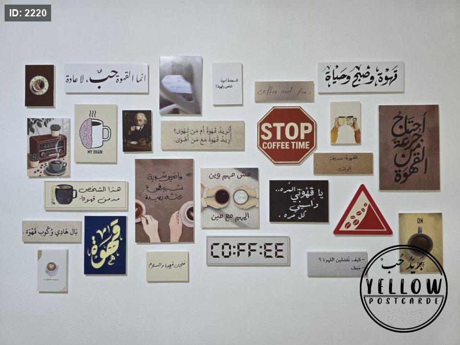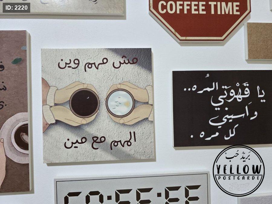 مجموعة فنية مميزة مُرتَّبة على الحائط تتكوّن من لوحات مختلفة الأحجام، كلها تدور حول ثيمة القهوة بروح دافئة ولمسات كلاسيكية. تظهر في الجدارية عبارات عربية بخط جميل، ورسومات يدوية، وصور فوتوغرافية، مما يعطي المكان طابعًا هادئًا ومليئًا بالطاقة الإبداعية.