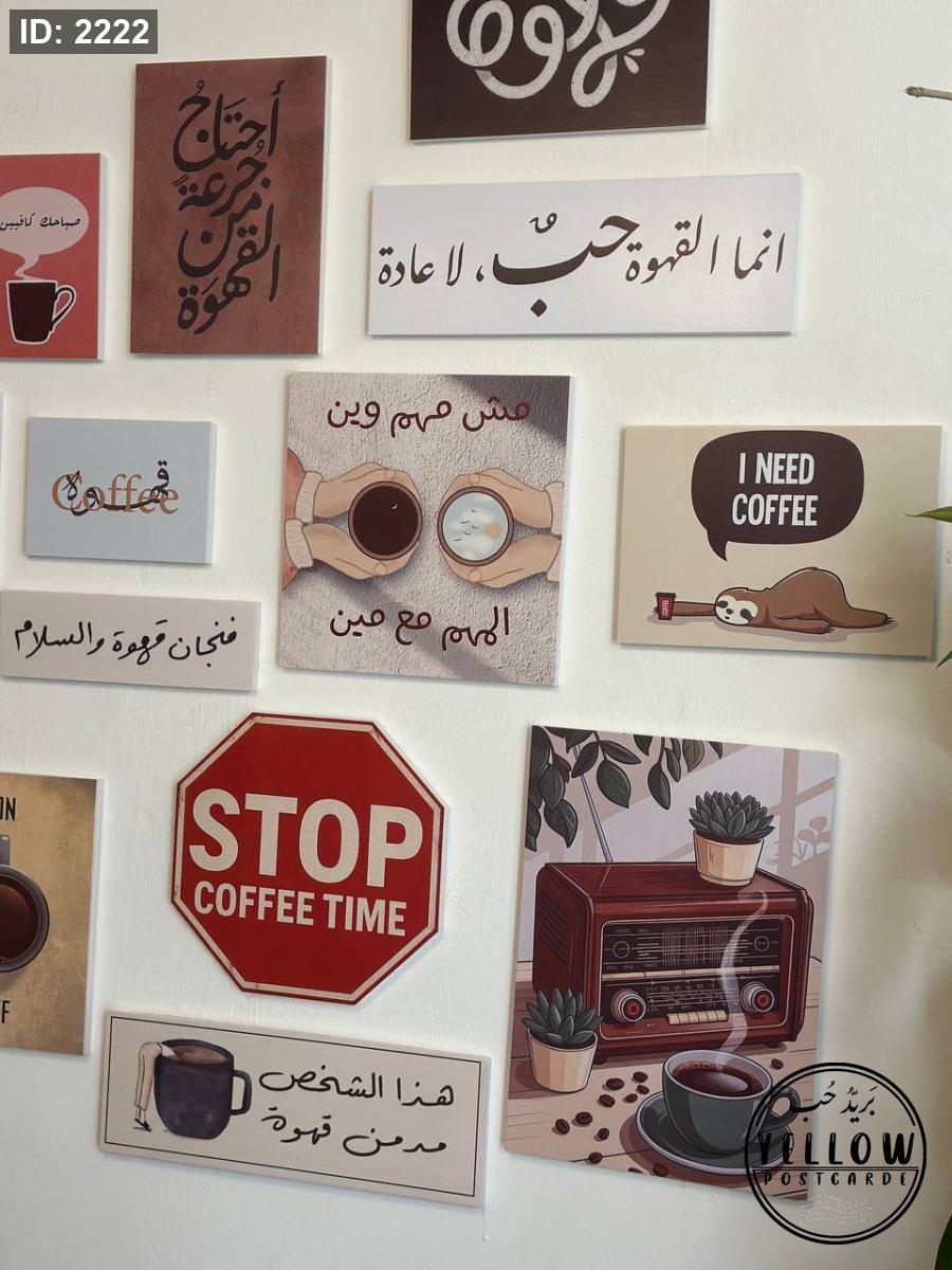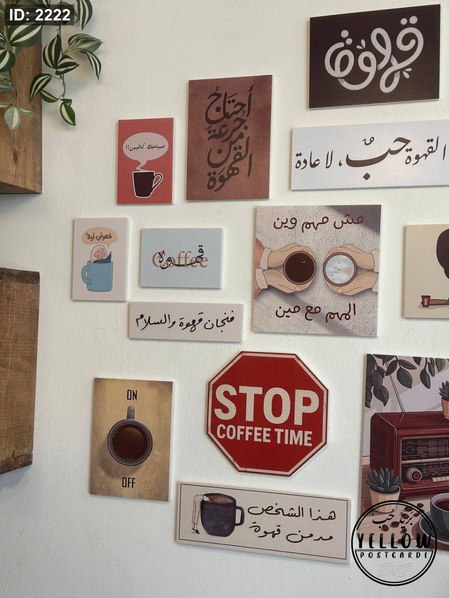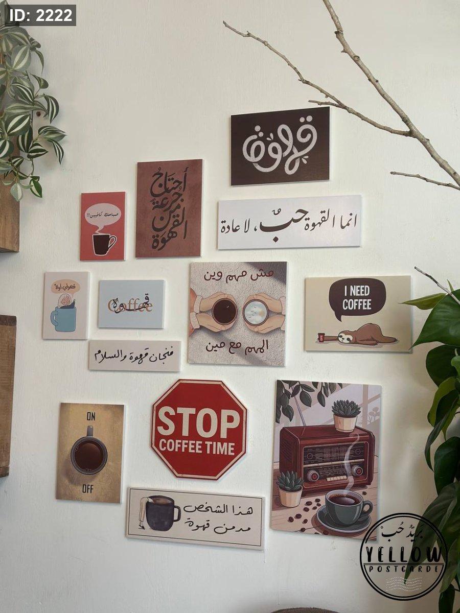 جدارية قهوة جميلة تجمع لوحات متنوعة بألوان دافئة ورسومات وعبارات مرتبطة بالقهوة، مرتبة بشكل منسق يضيف لمسة مزاجية وديكورًا هادئًا لزاوية القهوة أو لأي مساحة داخلية.