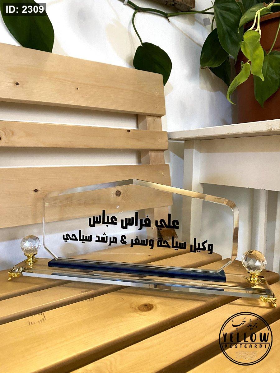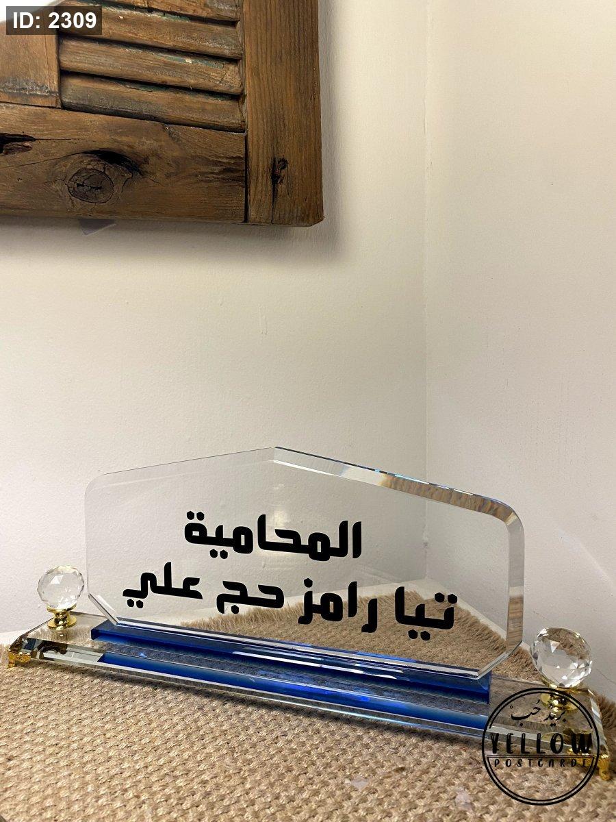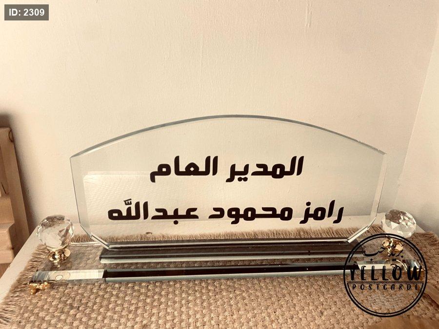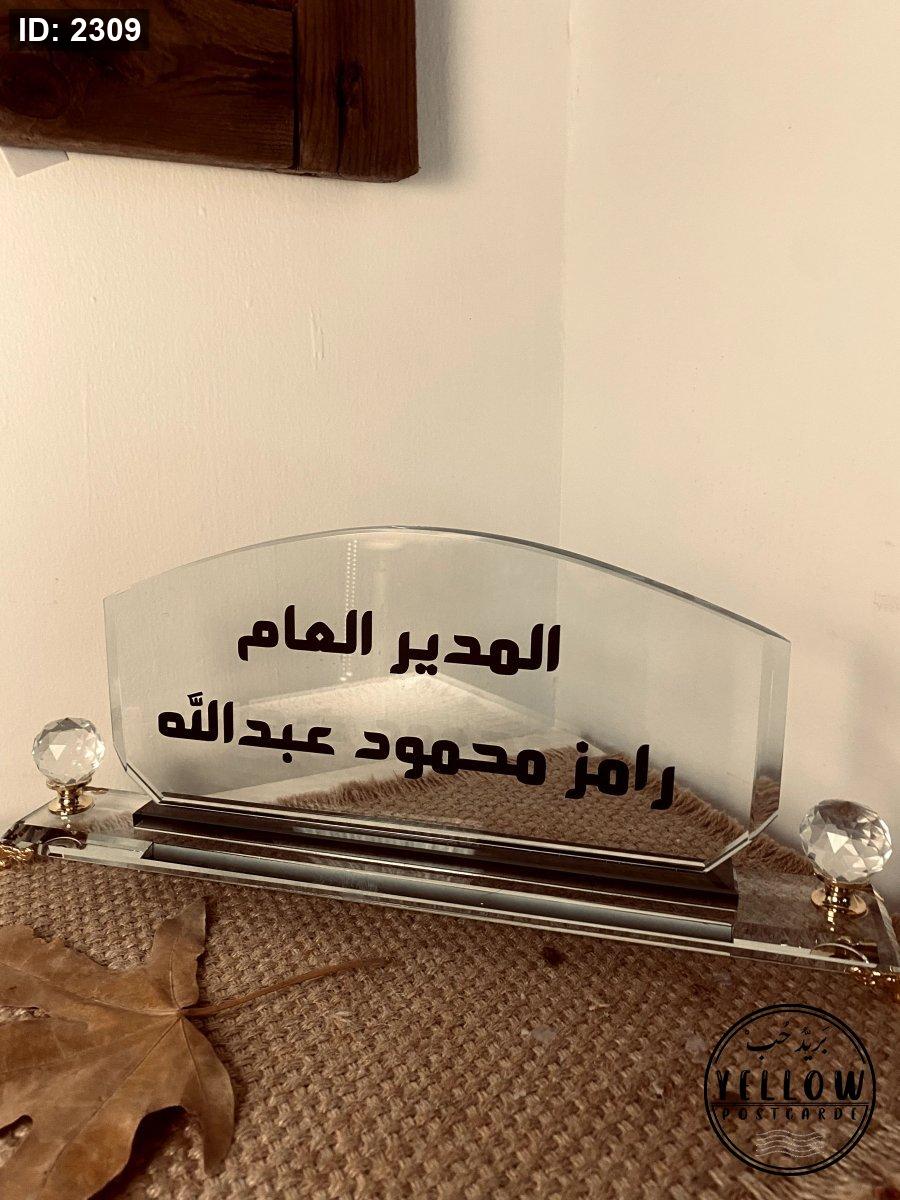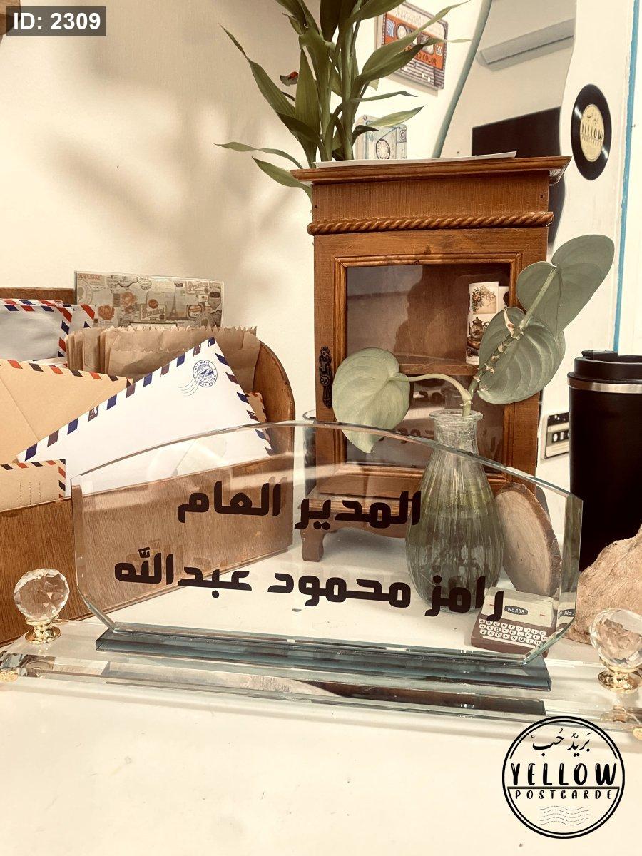 ستاند اسم مكتبي مصنوع من الزجاج السميك المعالج.