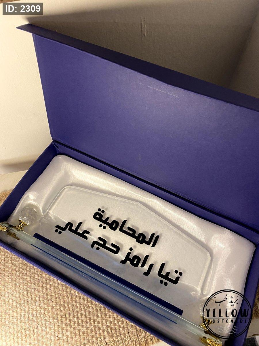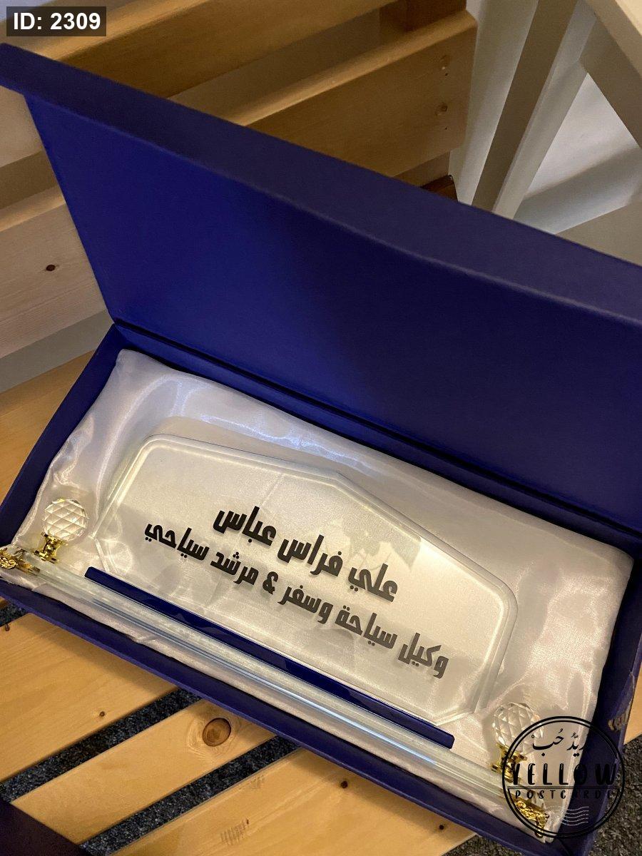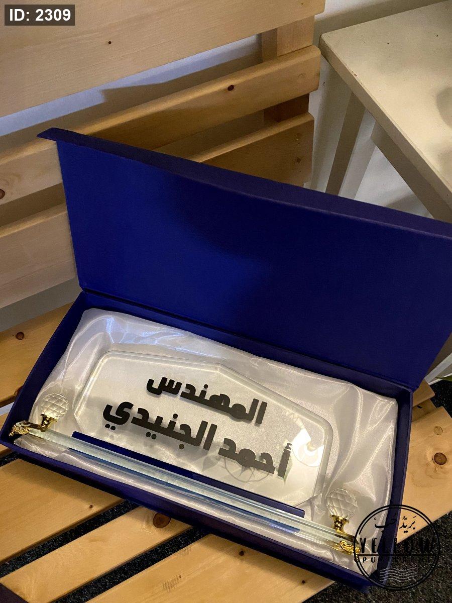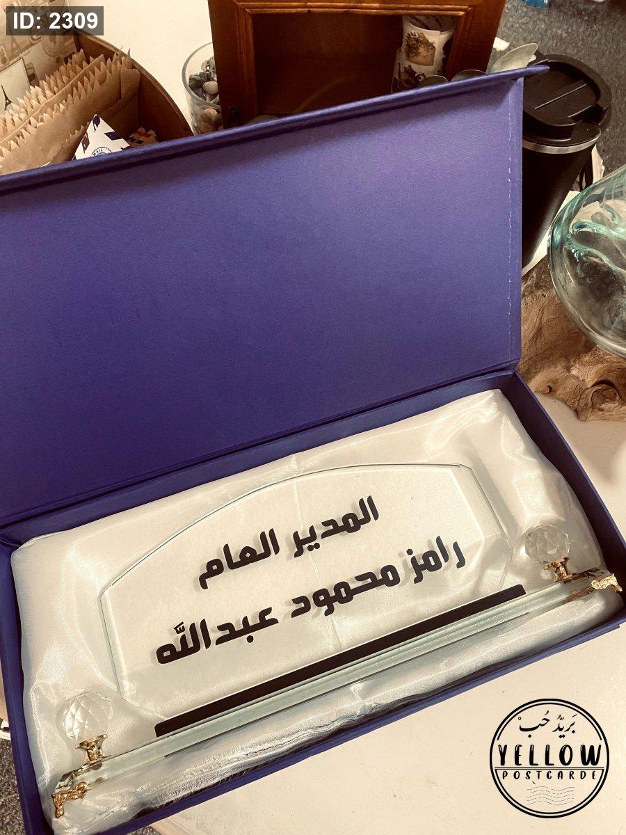 ستاند اسم مكتبي مصنوع من الزجاج السميك المعالج.