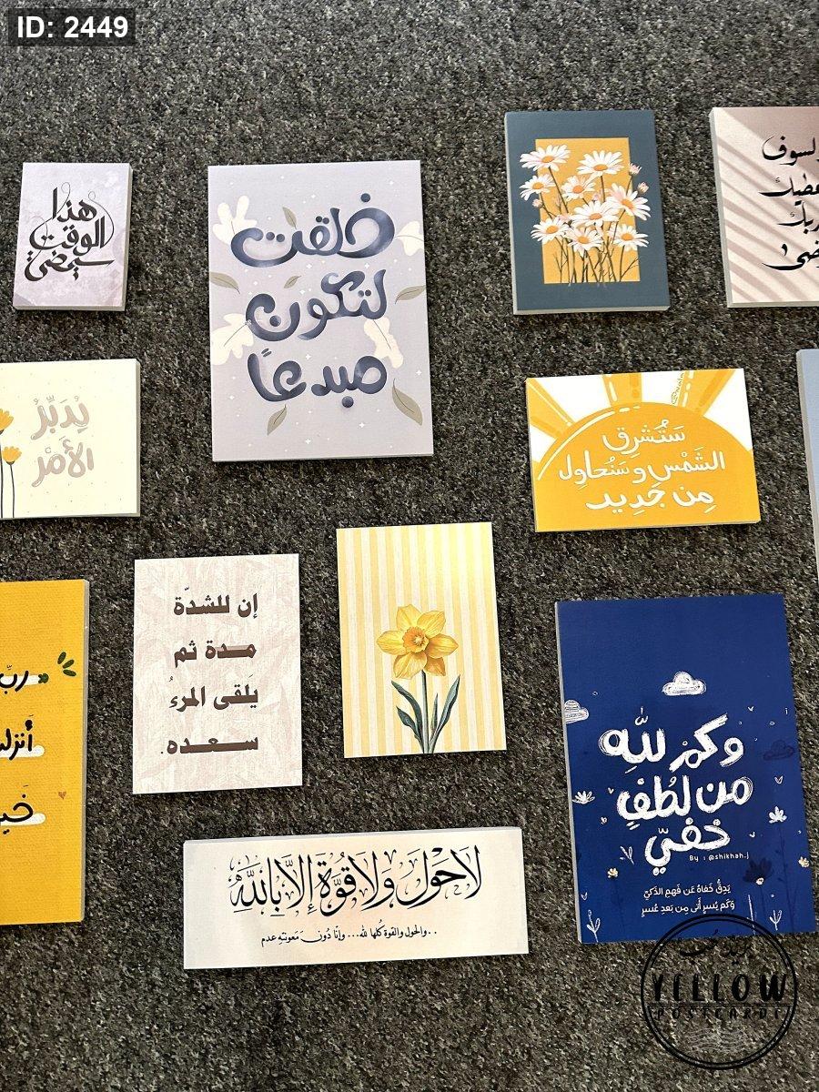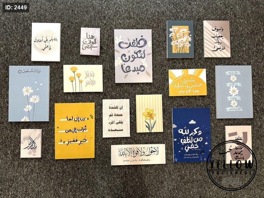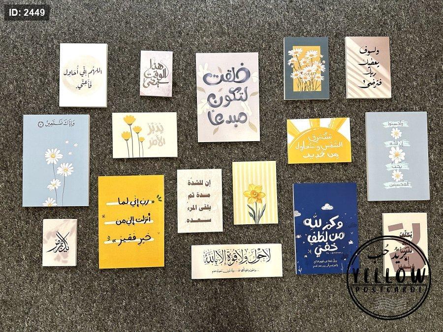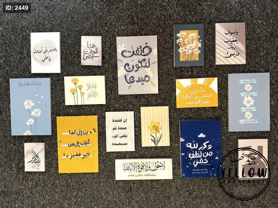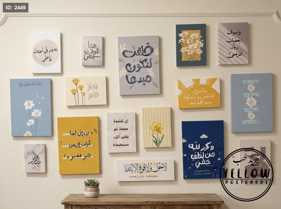 تتضمن اللوحات مزيجاً من النصوص العربية (آيات قرآنية، أدعية، وعبارات تحفيزية) مع رسومات فنية مبسطة بأسلوب (Minimalist) تشمل أزهاراً كالأقحوان والنرجس، وأشعة شمس، وغيوم.