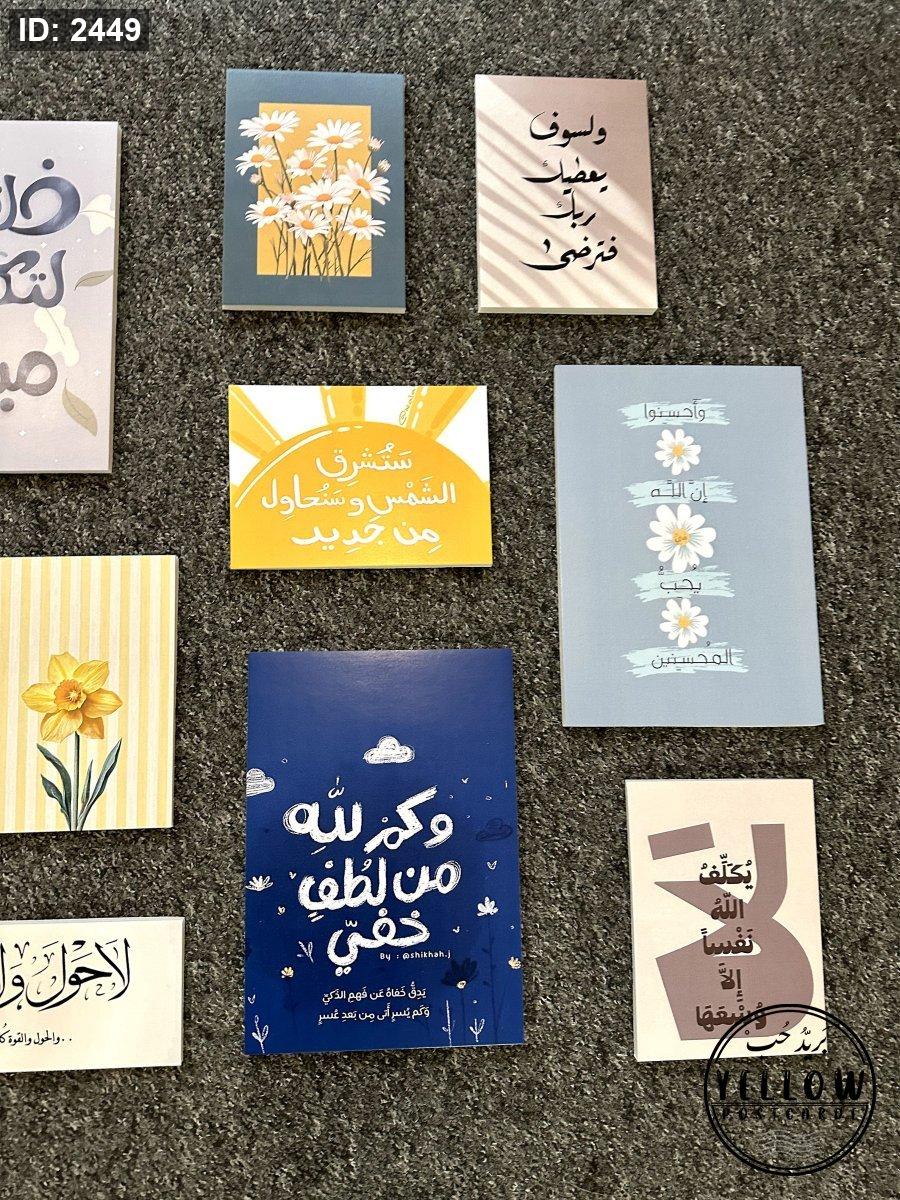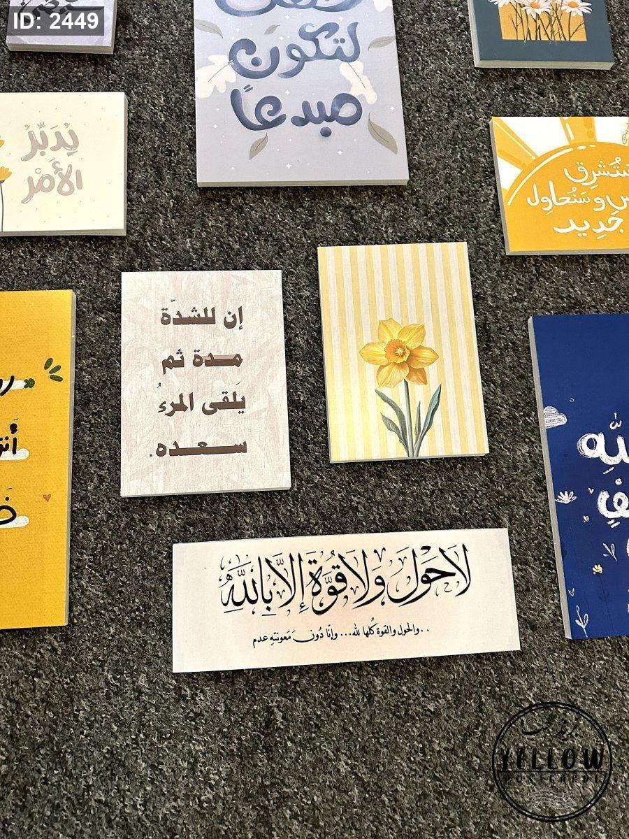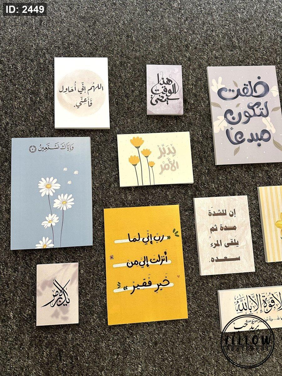 تتضمن اللوحات مزيجاً من النصوص العربية (آيات قرآنية، أدعية، وعبارات تحفيزية) مع رسومات فنية مبسطة بأسلوب (Minimalist) تشمل أزهاراً كالأقحوان والنرجس، وأشعة شمس، وغيوم.